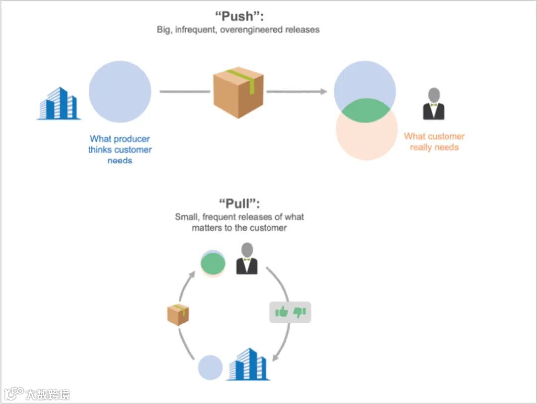 传统的、基于推动的交付系统产生的发布量大且不频繁,这些发布通常提供的价值太少,太晚。解决办法是建立基于拉动的流,小批量的工作被优先考虑并快速交付,以获得快速的客户反馈。