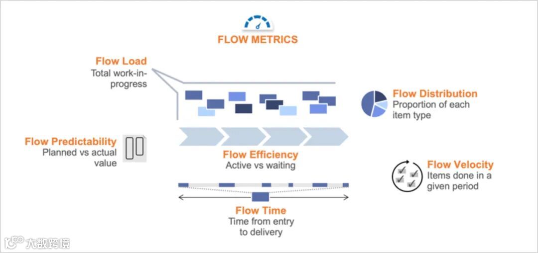 一个追求完美交付的组织必须定期根据确定的绩效目标评估其价值流。适当的指标,包括定量和定性的指标,为有效的决策提供了基础,用事实代替了主观意见。流动指标(图8)提供了一个全面的观点,即工作在价值流中流动,以及工作流动的速度、可预测性和效率如何。这些客观的衡量标准有助于确定交付瓶颈的确切位置。