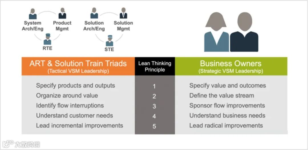 VSM需要组织中具有业务、技术和流程专长以及战略和战术影响力的领导者做出积极、持续的努力。在SAFe中,传统上只由价值流经理承担的责任由ART、Solution Train和业务负责人共同承担,以确保有效的价值流管理规模。