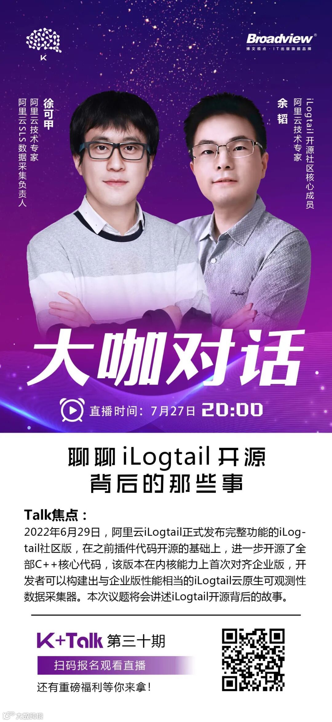 27日晚八点,徐可甲老师将受邀参加由K+全球软件研发行业创新峰会独家冠名播出的K+Talk大咖对话直播节目,与另一位阿里云技术专家/iLogtail开源社区核心成员余韬老师共话【iLogtail开源背后的那些事】,感兴趣的同学赶快扫码预约观看吧,还有豪礼等你来拿!