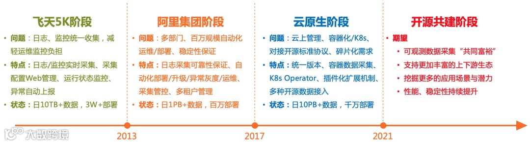 随着阿里推进核心业务全面上云,以及iLogtail所属日志服务(SLS)正式在阿里云上商业化,iLogtail开始全面拥抱云原生。面对多元的云上环境、迅速发展的开源生态和大量涌入的行业客户需求,iLogtail的发展的重心转移到解决如何适应云原生、如何兼容开源协议和如何去处理碎片化需求等问题上。2018年iLogtail正式支持docker容器采集,2019年支持containerd容器采集,2020年全面升级Metric采集,2021年增加Trace支持。通过全面支持容器化、K8S Operator管控和可扩展插件系统,iLogtail支持千万部署规模,数万内外部客户,百万+采集配置项,实现日数十PB数据的稳定采集。