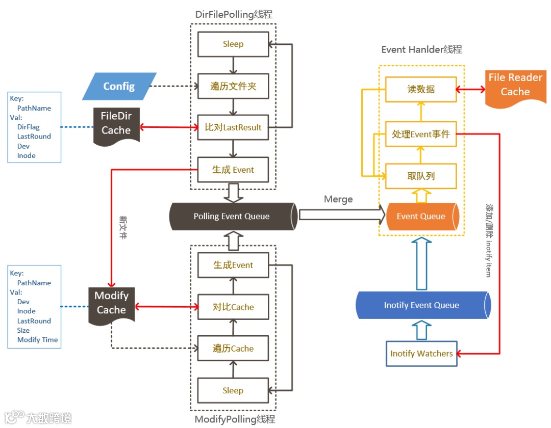 C++核心源代码包含了功能完整的文件发现机制,可以支持通配符和多层次目录的动态日志文件监控,并支持日志轮转、日志数、轮转大小设置。iLogtail在Linux下使用inotify作为文件监控的主要手段,提供了毫秒级延时的数据发现能力,同时为了兼顾不同操作系统以及支持各类特殊采集场景,iLogtail同时使用了轮询作为的数据的发现方式。通过使用轮询与事件并存的混合方式,iLogtail打造了一套兼具性能优势同时不失鲁棒性的文件发现机制。