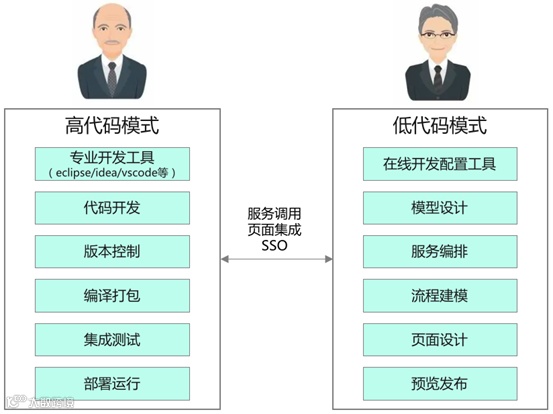 第一张图是业界常见高开和低开应用融合模式,两者独立建设,技术实现确实相对简单,但是难道需要高低开融合的数字化应用,以后都是这种建设模式吗?显然是不对的,这种"混合"模式,本质上又建立了一个低代码孤岛,仅仅是通过技术手段将两者混合在一起。