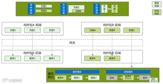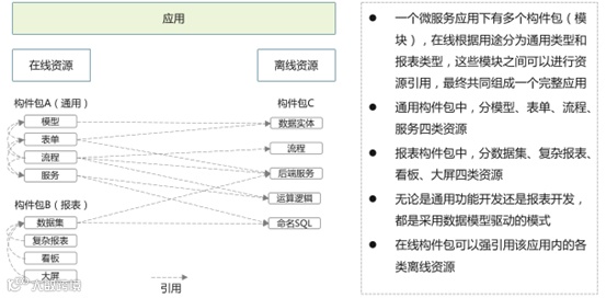 上面这张图是高低开融合的全景图,里面包含了高低开都需要的开发、运行、治理、服务发布,以及流程、组织、权限这类企业级应用需要共享的服务等,如果大家关心具体资源的融合与引用关系,我们则可以关注下面这张示意图,最终高低开的多个模块是打成一个完整包来投产的: