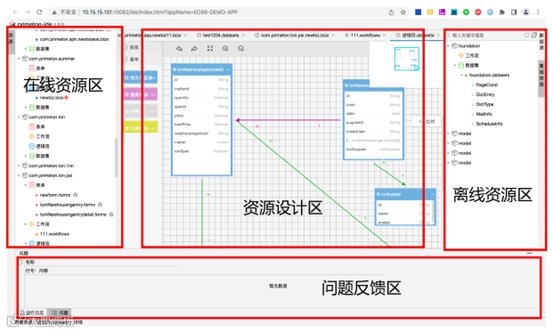 资源设计区:提供各类资源的编辑器,包括表单、流程、服务、模型、数据集、报表、大屏等