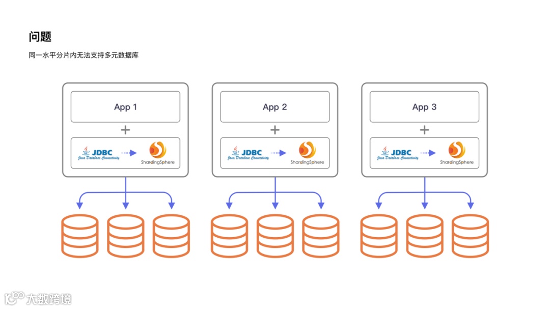 最后,大量企业采用单元化架构。基于数据分片的解决方案,将数据库的拆分和单元化一并放到应用端解决。随着数据库数量的增多,架构设计的复杂度会呈指数级增长。长此以往,业务开发团队将无法把精力集中在最擅长的业务研发层面,反而需要花费大量精力投入到基础组件的维护。尽管 Apache ShardingSphere 的数据分片功能可以较好解决相关问题,但面对更多元的数据库,仅支持单一品类数据库的水平分片能力是远远不够的。