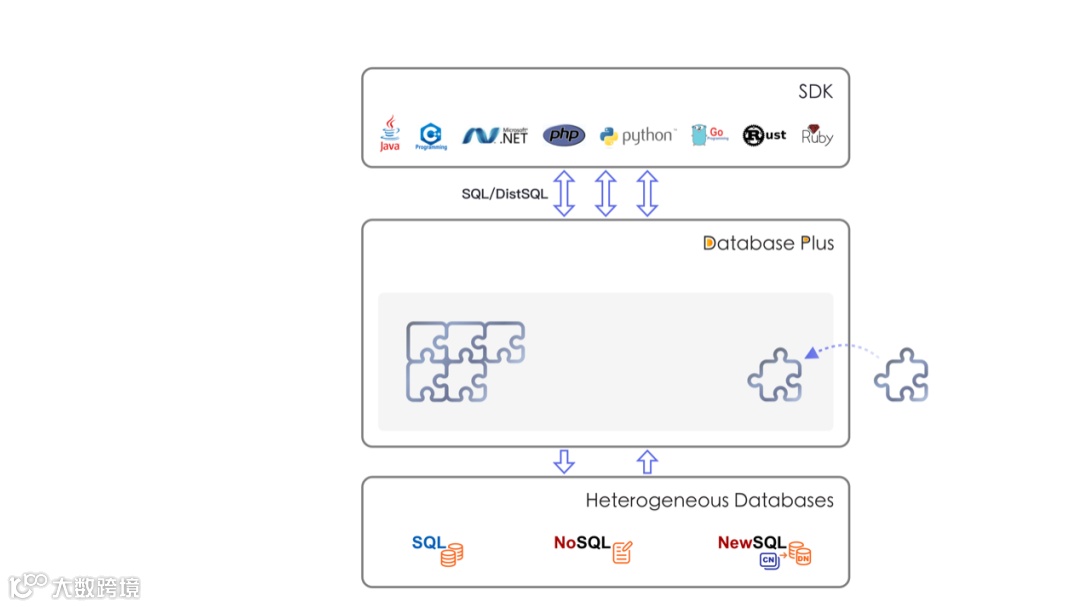 通过可插拔体系,Database Plus 将能够真正的构建面向数据库的功能生态,将异构数据库的全局能力统一纳管。它不仅面向集中式数据库的分布式化,也同时面向分布式数据库的竖井功能一体化。
