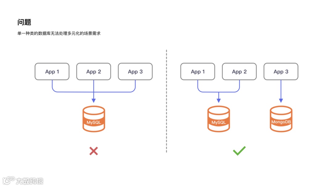 首先,单一品类的数据库无法满足业务应用的全部需求,在高吞吐量、低延时、分布式无感知、强一致性、运维友好度甚至稳定性等方面难以做到面面俱到。一个应用需要多种数据库共存的可能性尚且不高,但多个应用混用多种数据库的可能性则大大提升。