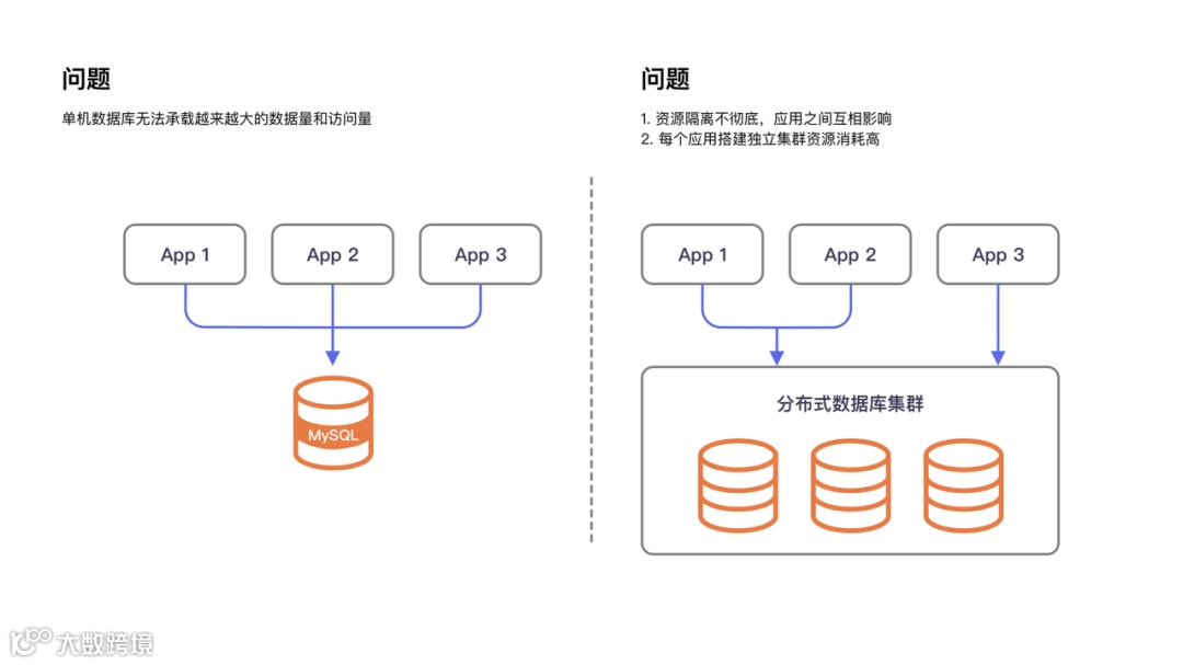 其次,无论是单机数据库,还是 All in One 的分布式数据库集群,都难以成为众多微服务应用后端的唯一存储支撑。单机数据库无法承载越来越大的数据量和访问量,所以越来越多的应用选择采用分布式解决方案。然而,多应用使用统一的数据库集群,在 CPU、内存、磁盘、网络等方面的负载无法做到完全隔离。一个应用的超额资源使用,可能会导致众多毫不相干的应用服务质量下降。