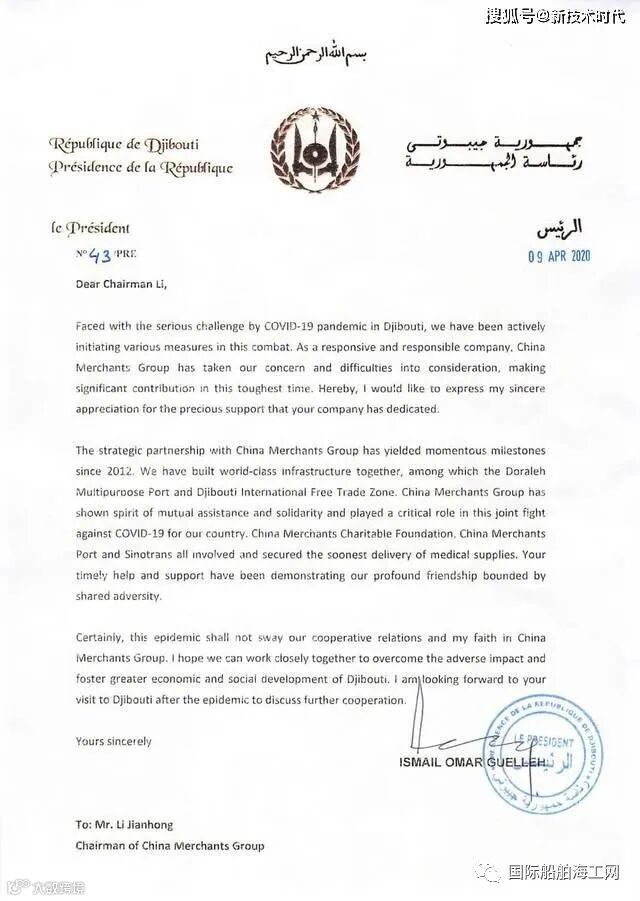 4月9日,吉布提共和国总统伊斯梅尔·奥马尔·盖莱致函招商局集团董事长李建红,感谢为吉布提防疫抗疫事业做出巨大贡献。