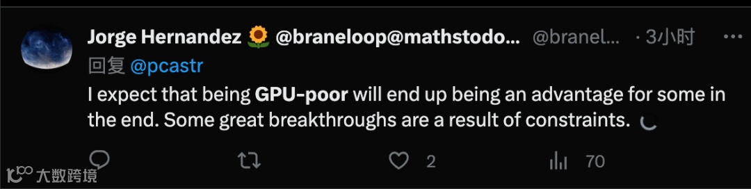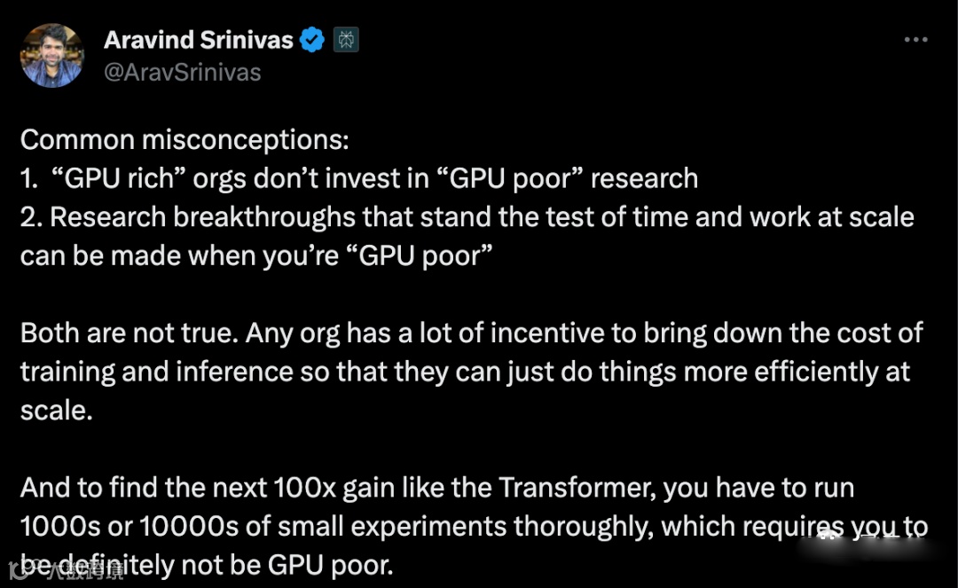 但Perplexity.AI联合创始人Aravind Srinivas认为,GPU丰富的组织实际也会投资于带限制条件的研究。