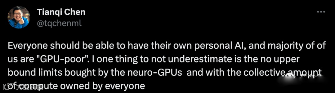 正致力于让手机跑大模型的知名学者陈天奇表示,未来每个人都会拥有自己的AI助手,其中大多数人都会是“GPU贫民”,但不要低估合起来的总量。