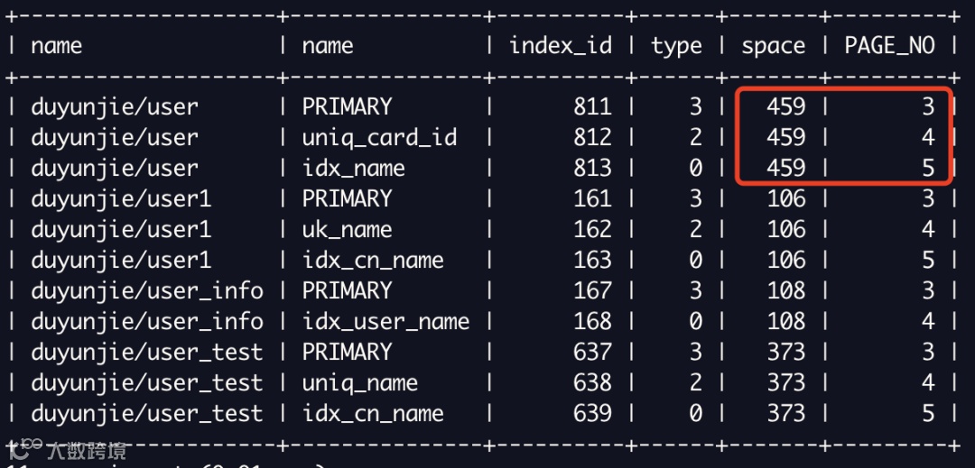 接下去的问题就是怎样得到一张表所有索引的Root页所在的位置呢?在《MySQL技术内幕:InnoDB存储引擎》书中分析过<space,3>这个页(即ibd文件的第3个页面,从0开始)是聚簇索引的Root页,在《MySQL内核:InnoDB存储引擎 卷1》中也分析,Root页的位置通常是不会更改的。那么其他索引的Root页所在的位置呢?通过下面的SQL语句可以查出表中各索引的Root页信息: