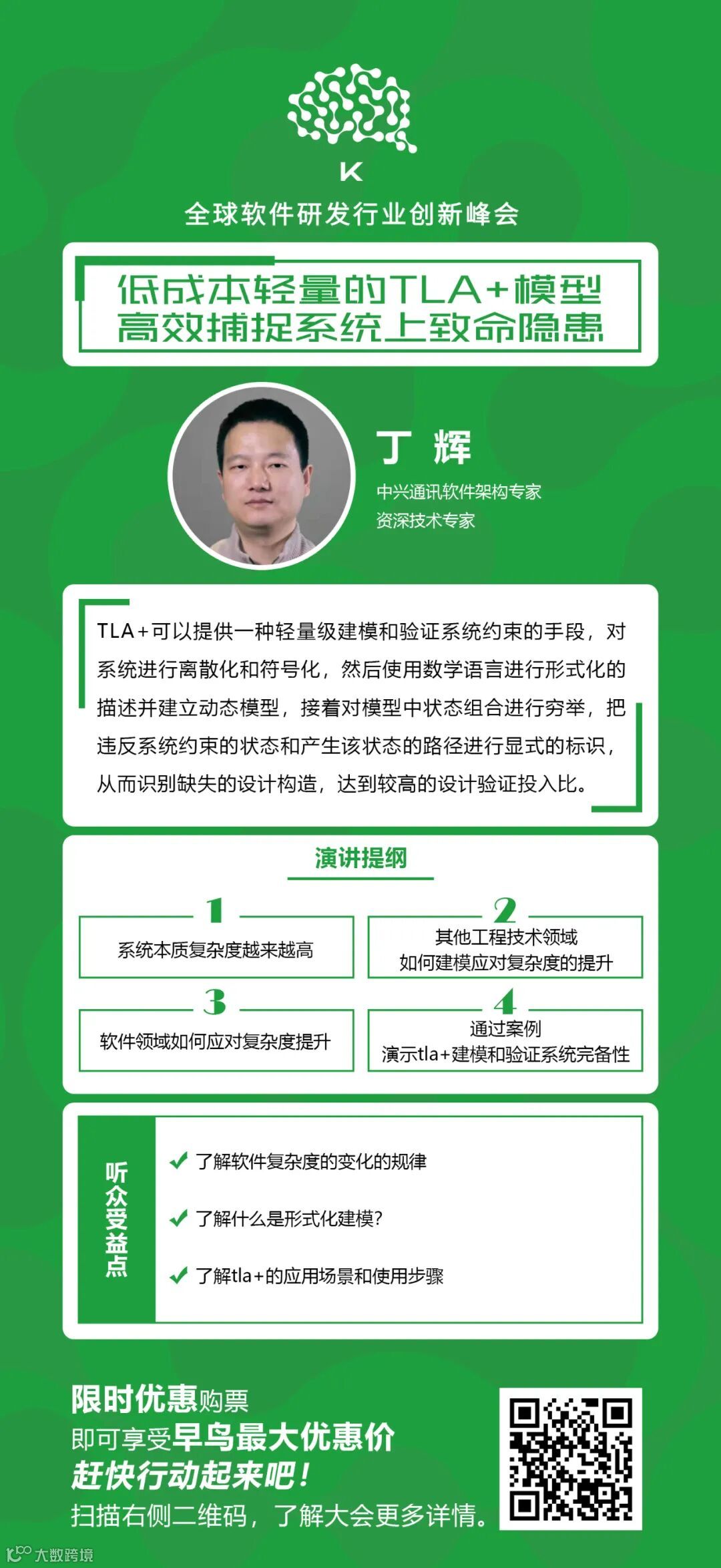 丁辉老师将作为“代码安全”专题出品人,作《低成本轻量的TLA+模型高效寻找系统上致命隐患》的主题演讲,进一步详解TLA+的建模理论和高效实践。