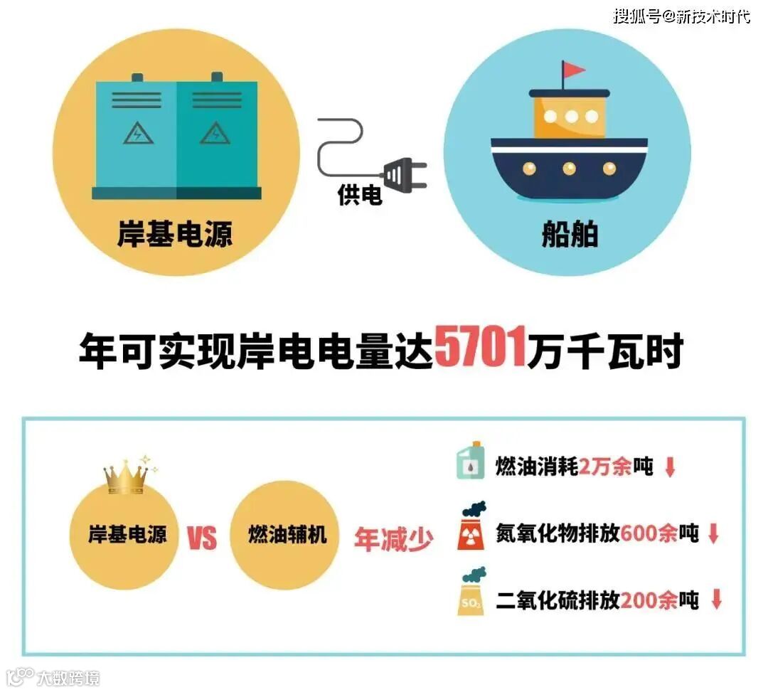 利用岸基电源向停靠港口的船舶供电,年可实现岸电电量达 5701万千瓦时 ,与燃油辅机发电相比,年减少燃油消耗 2万余吨 、氮氧化物排放 600余吨 、二氧化硫排放 200余吨 。