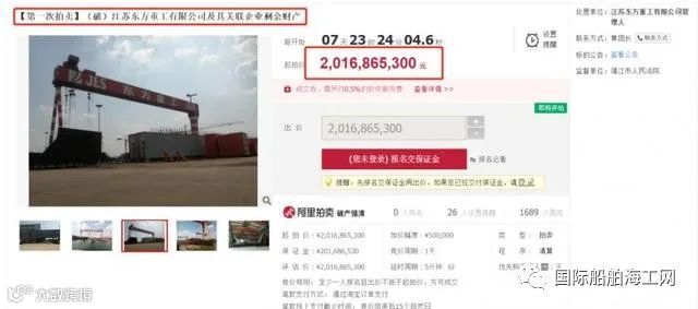 5月6日,破产的民营船厂江苏东方重工在淘宝阿里司法拍卖平台成功拍卖,成交价约8.26亿元。