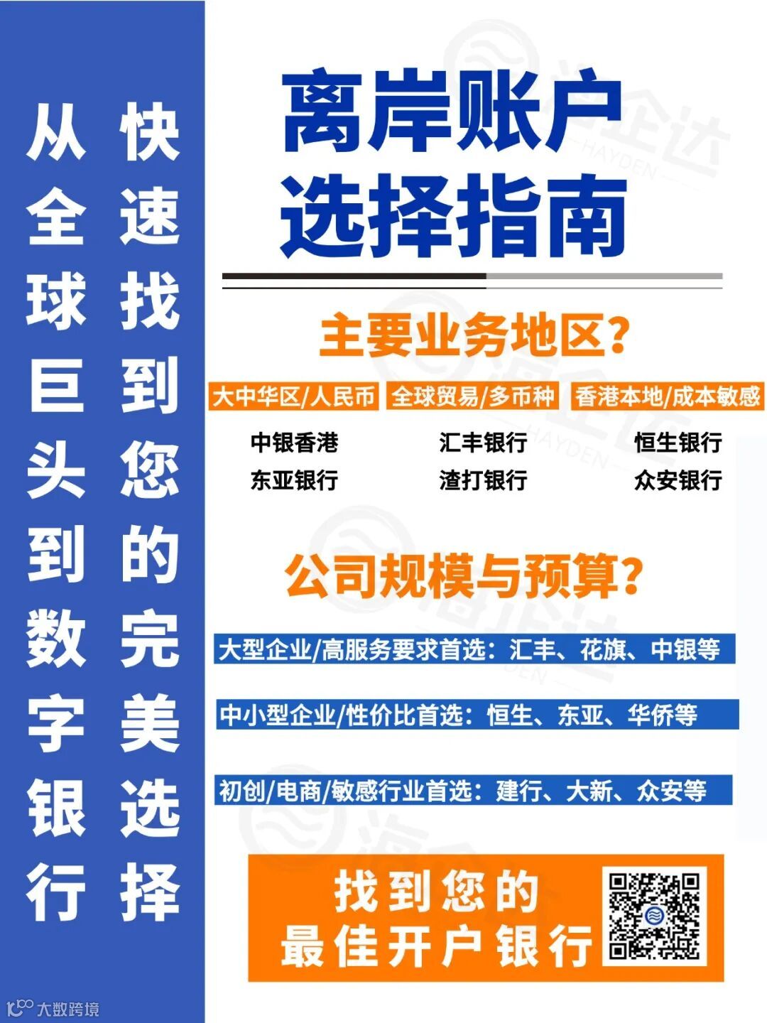如果您的企业也需要注册海外公司,银行开户等,身份证及资产规划,可以找海企达办理,专业在线,给您最适合的解决方案(扫码即可获取更多资讯)↓↓↓