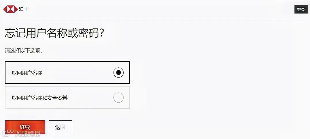 1.打开汇丰香港官网https://www.hsbc.com.hk/zh-cn/security/recoverProfile/(或 “汇丰香港” APP),在登录页面点击 “忘记用户名”;