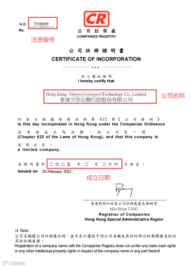 信息唯一:上面会标注公司唯一的 “注册编号”“公司名称(中英文)”“成立日期”,且有香港公司注册处的公章,不可伪造。
