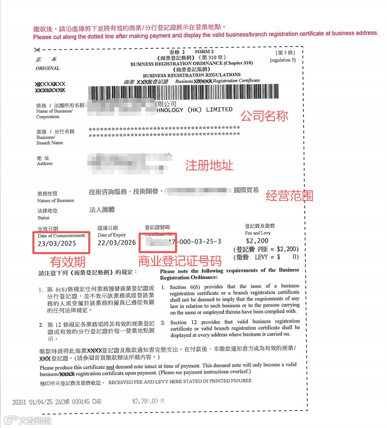 核心作用:商业登记证是公司从事商业活动的许可证明,由香港税务局签发。