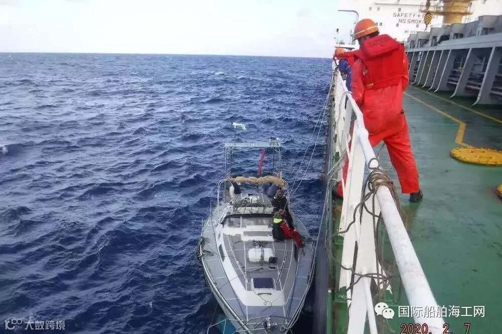 2名遇险人员顺利登上岫玉海轮主甲板,但体能已耗尽,站立不稳。船长查证后,安排人员搀扶护送他们到生活区内休息。至此,帆船遇险人员营救行动圆满成功。