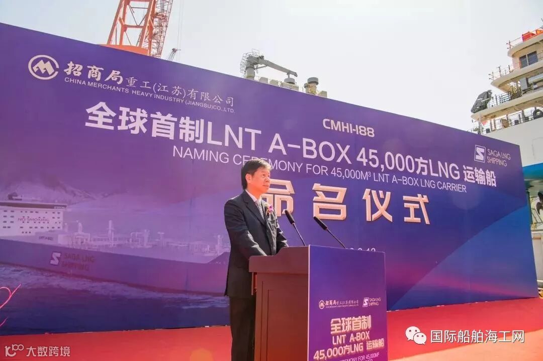 2019年3月13日,在招商局重工(江苏)有限公司1#码头隆重举行了45000m3 LNG运输船命名仪式。船东母公司Landmark Capital、船东Saga LNG Shipping、船东监造IMC、ABS、CCS、南京油运股份有限公司、美中能源集团、中海石油气电集团、江西鄱阳湖LNG公司、湖北民生石油液化气有限公司、台州五洲、上海船舶研究设计院、Bestway、LNT Marine、上海FKAB等主要负责人,招商局工业集团和江苏重工主要领导共同出席仪式。招商工业副总经理朱桂明致辞。