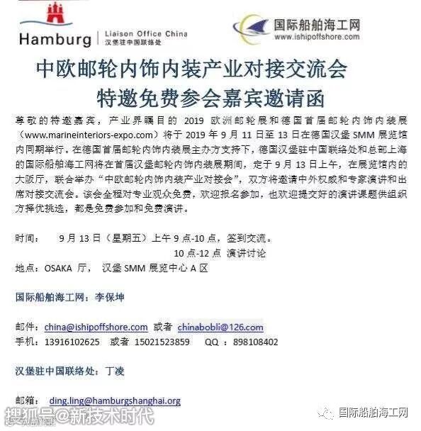 正筹备举办免费的“中欧豪华邮轮内饰内装对接交流会”将于9月13日在德国汉堡举办、2019第6届邮轮客滚船轮渡上海国际峰会、可协助巨额补贴参加2019欧洲最大海事展荷兰Europort、以及收费的900元刊登9月欧洲邮轮和内装内饰展会造船地图和”2019第三届船用洗涤塔和压载水系统上海峰会”的国际船舶海工网了解到。