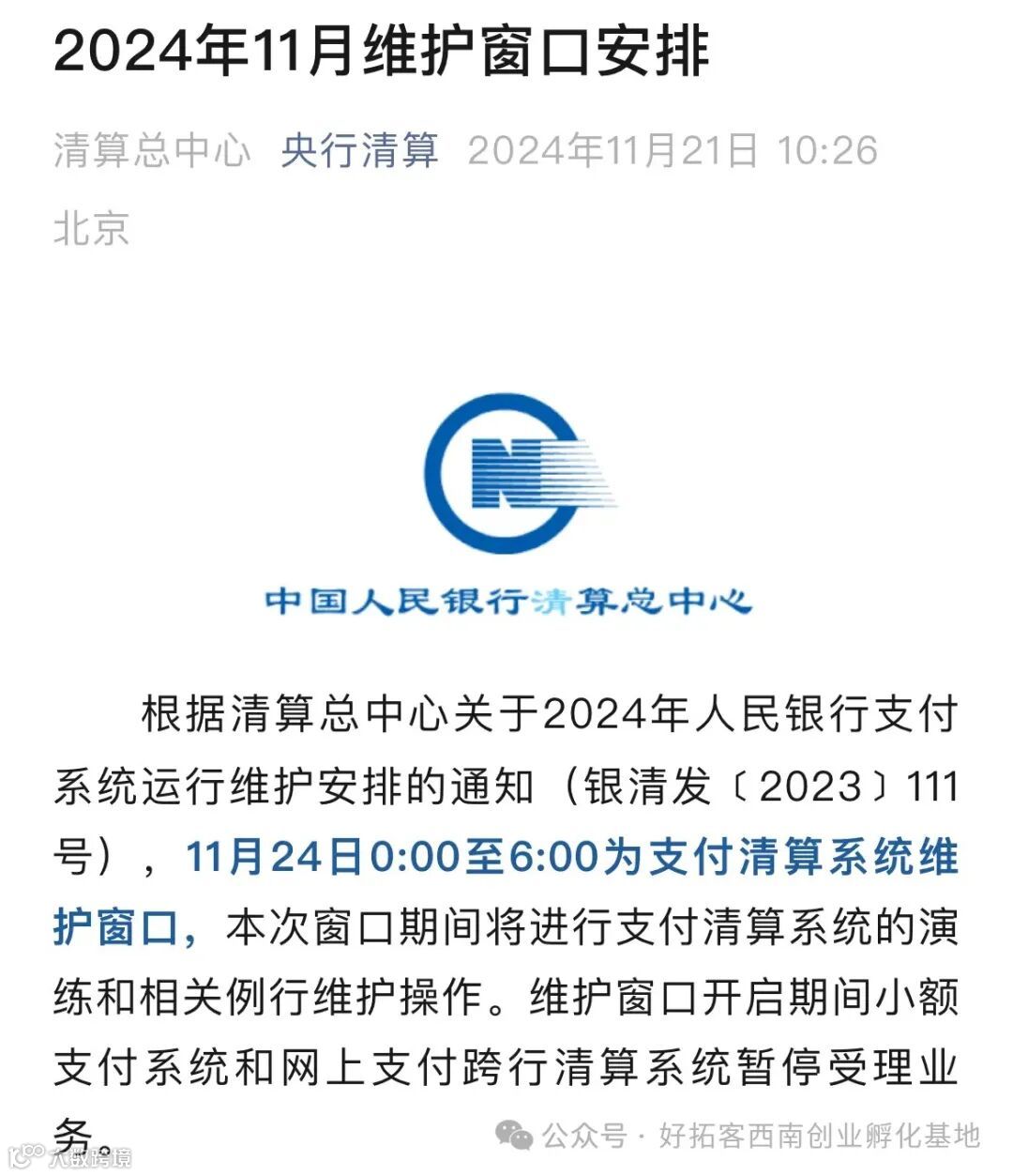 1、中国人民银行将于2024年11月24日0:00至6:00开启支付清算系统维护窗口。在此期间,小额支付系统、网上支付跨行清算系统暂停受理业务。