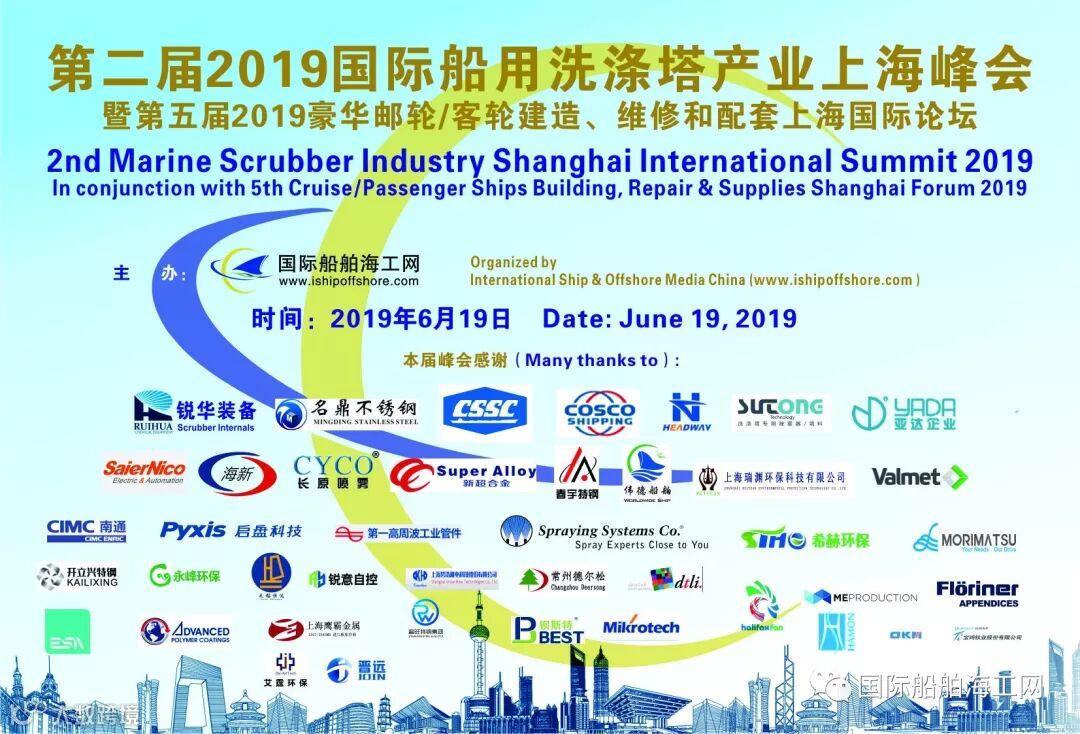 2019年6月18-19日在上海成功举办 的“第二届2019国际船用洗涤塔产业上海峰会 ” 。由活跃于国际产业界的新锐媒体国际船舶海工网主办,同时“第三届2019国际船用洗涤塔和压载水系统产业上海峰会 ”正在筹备定于2019年12月1-2日将在上海市中心继续举办 。预计有300多位来自来自中国、英国、美国、加拿大、德国、丹麦、挪威、瑞典、日本、法国、荷兰、芬兰、新加坡、马来西亚、韩国等国的船东、船厂、洗涤塔厂商、压载水厂商。配套厂家、设计和投资单位等已报名参加,将汇聚上海,交流、探讨和分享全球限硫令下船舶脱硫洗涤塔的机会、挑战、合作等。报名邮件: chinabobli#126.com 或者 china#ishipoffshore.com