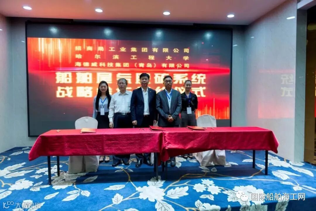 在峰会上,海德威科技集团(青岛)有限公司与招商局工业集团、哈尔滨工程大学在200多名中外船东、船厂、金融投资、船舶服务及业界代表的见证下,成功举办了海洋卫士®船舶尾气脱硫系统产品发布会和战略合作协议签字仪式。招商局工业集团友联船厂总经理朱桂明、哈尔滨工程大学周松教授和海德威科技集团(青岛)有限公司董事长曹学良出席了仪式,并签署了战略合作协议。