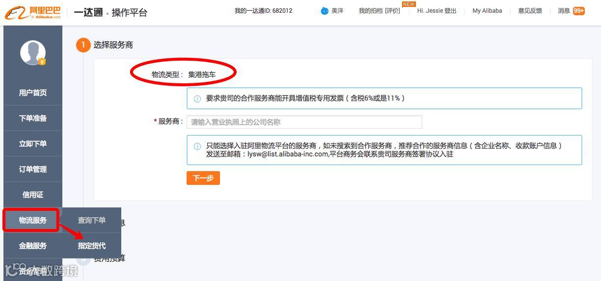 一达通客户登录MO后台,在“物流服务”中的“指定货代”项,下集港拖车订单,下单过程中指定给入驻到平台上的车行来承接订单操作的全过程统称为给指定货代下单。