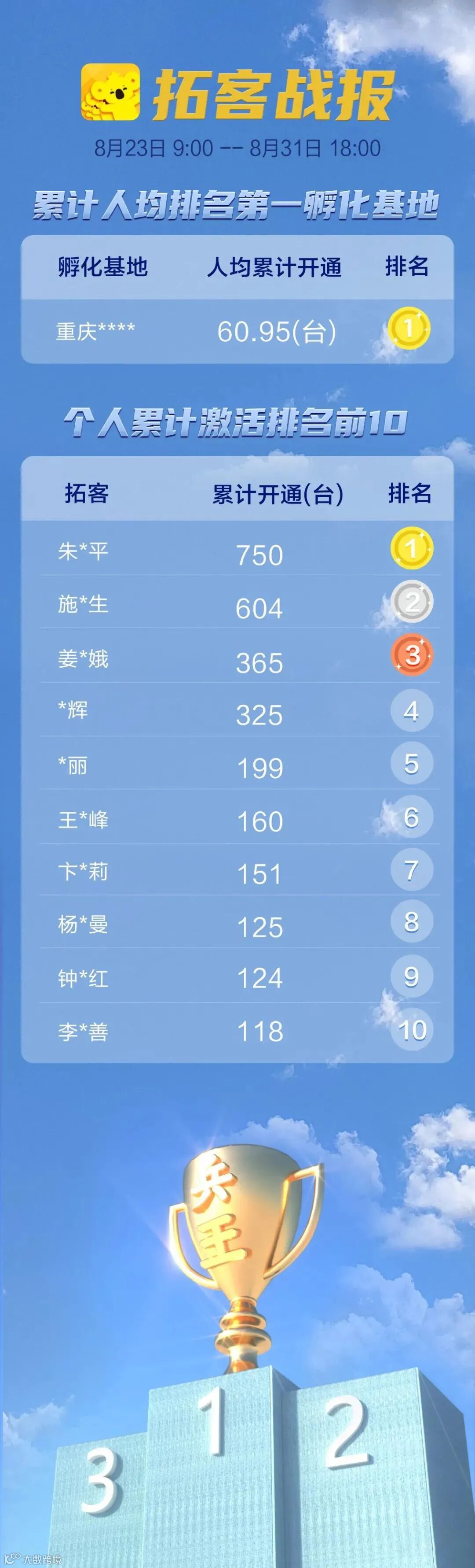 8月31日,拉卡拉好拓客为期九天的全国首期拓客之王PK赛圆满结束,经过多天的激烈角逐比拼,最终“拓客之王”前十强及“最强拓客兵王基地”诞生。