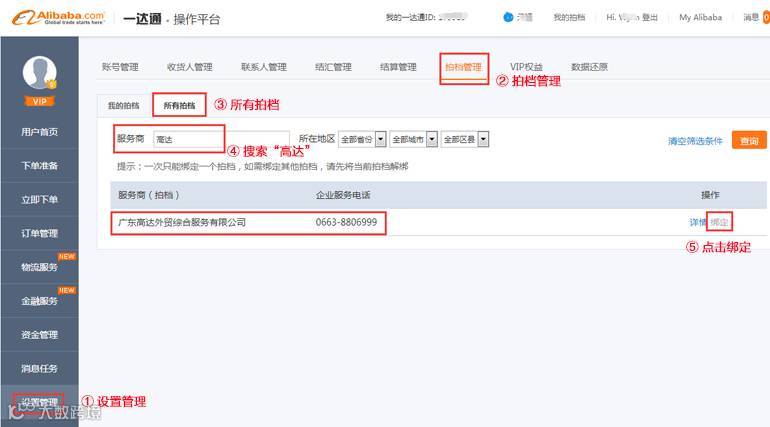 请在阿里巴巴一达通操作平台-->>打开【设置管理】-->>打开【拍档管理】-->打开 【所有拍档】-->>搜索“高达”,并绑定广东高达外贸综合服务有限公司。