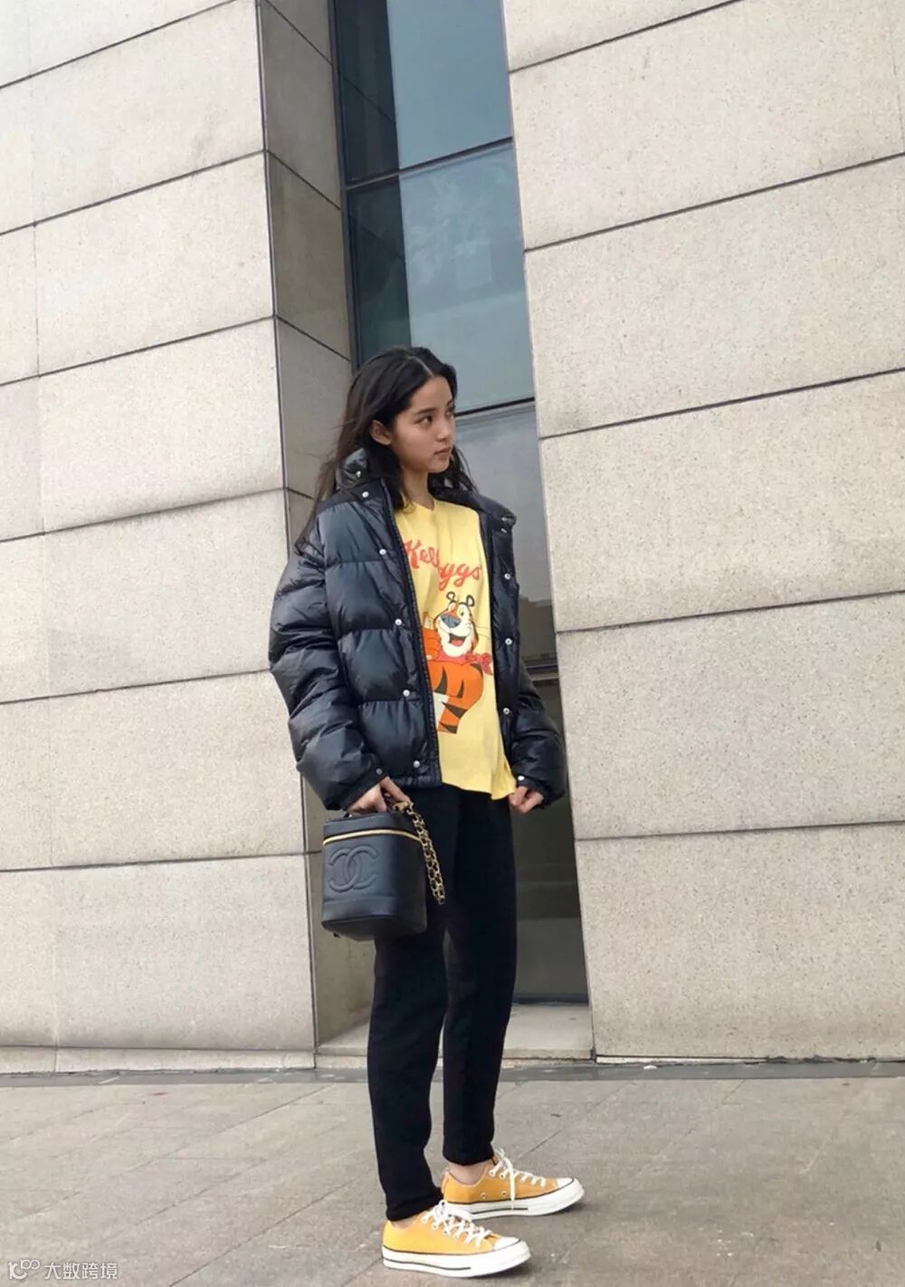 下面这款荔枝皮CHANEL黑色化妆包,也同样是许多CHANEL爱好者的心头好!欧阳娜娜内搭嫩黄色卡通卫衣,同色的帆布鞋与内搭相呼应,简单的纯黑色外套搭配同色的长裤,手提的CHANEL黑色化妆包款式特别,成为一大亮点!