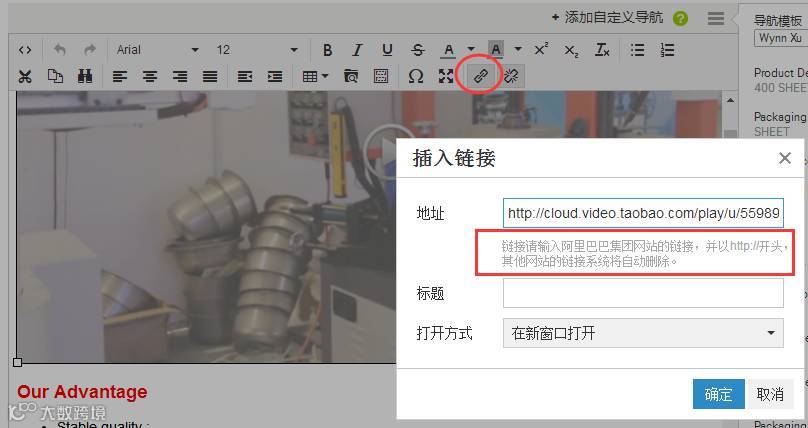 这里有提示“链接请输入阿里巴巴集团网站的链接,并以http://开头,其他网站的链接系统将自动删除”。