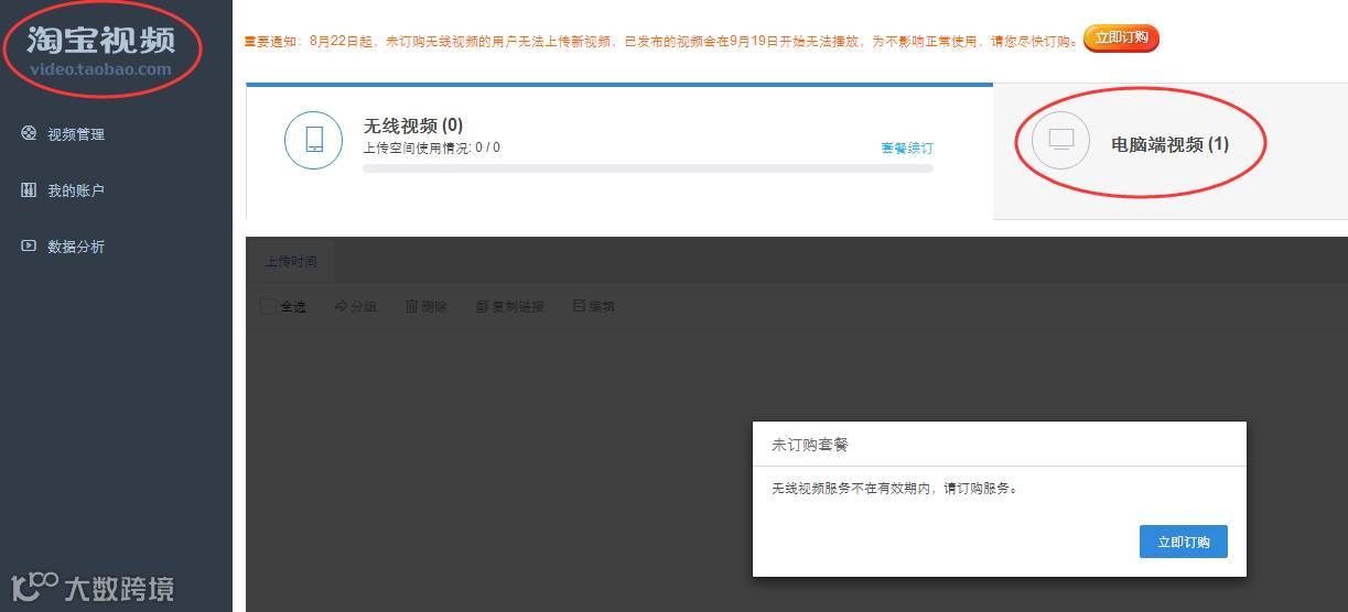 注意:第一次打开淘宝视频的网址,会出现”无订购套餐“的小窗口,我们不用理会它,直接点击上方的”电脑端视频“。