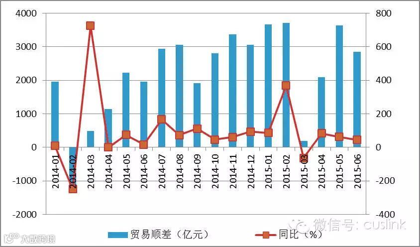 图表2:2014年1月-2015年6月我国进出口贸易顺差情况