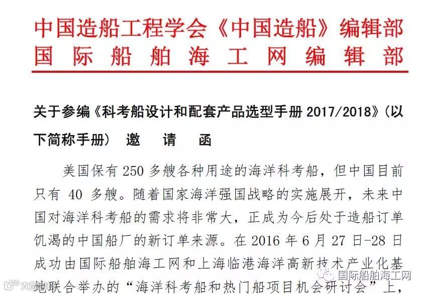 针对目前中国科考船建造热和规划热,国际造船届著名的刊物团队中国造船工程学会《中国造船》编辑部和新锐的活跃专业媒体国际船舶海工网决定,联合组织国内外行业专家,编辑发布《科考船设计和配套产品选型手册2017/2018》(以下简称《手册》)。