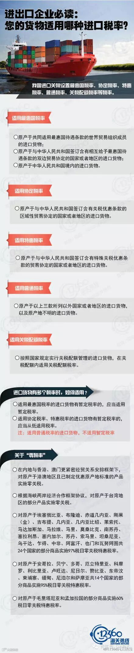 我国进口关税设置最惠国税率、协定税率、特惠税率、普通税率、关税配额税率等税率,不同的进口货物适用不同税率。您的货物适用哪种进口税率?进口企业快看过来!