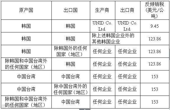 2015年6月8日,印度对原产于中国、欧盟、韩国和中国台湾的碳酸钾作出反倾销日落复审终裁:自中国和欧盟进口涉案产品的倾销幅度和损害幅度均为微量,因此取消对中国和欧盟涉案产品反倾销措施,但继续对韩国和中国台湾涉案产品征收反倾销税,税率见下表。