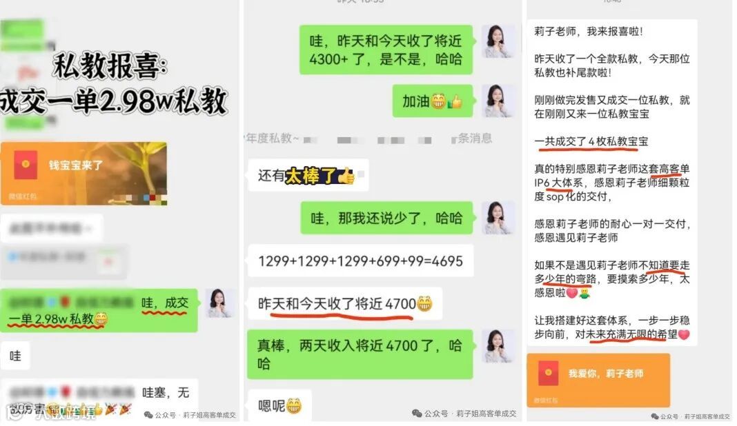 成交一单2.98W私教;两天收入近4700;日入6980;收到4位私教全款……