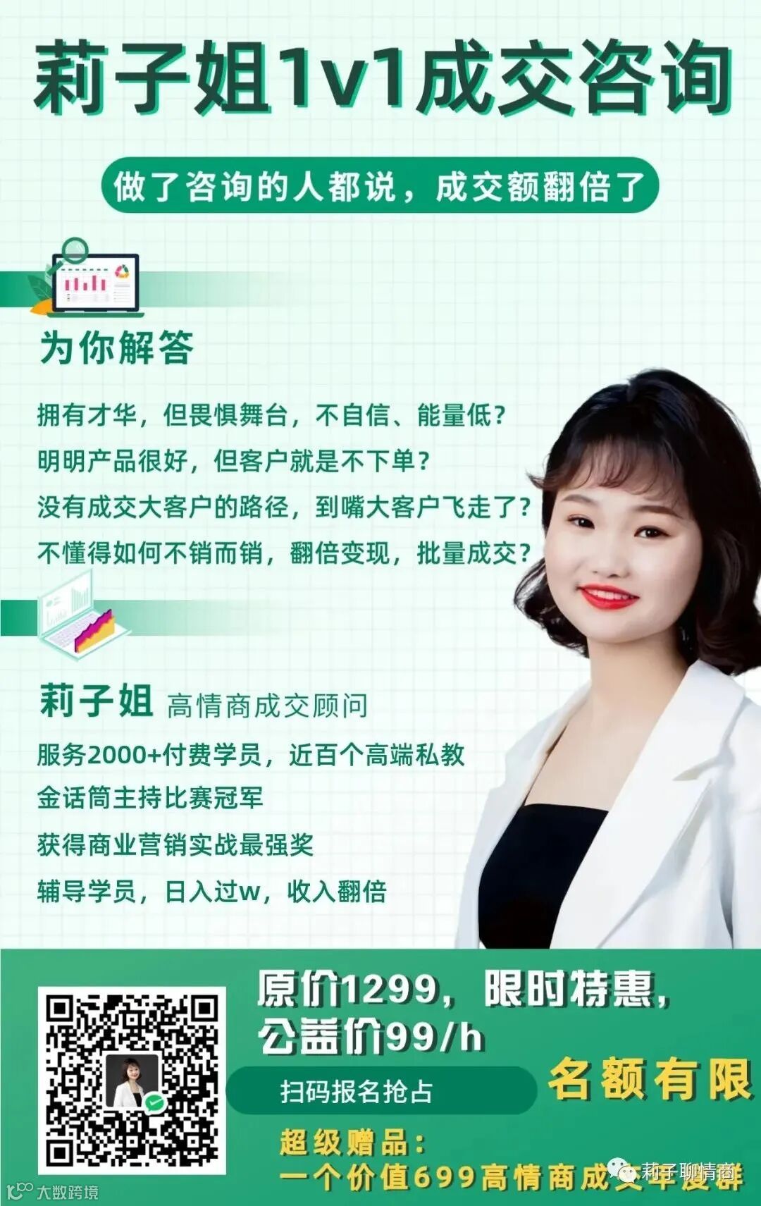 欢迎添加下方👇🏻莉子姐的微信,回复暗号:我渴望成长,免费赠送你价值1699的《高情商成交变现秘笈》,助你开口来财。