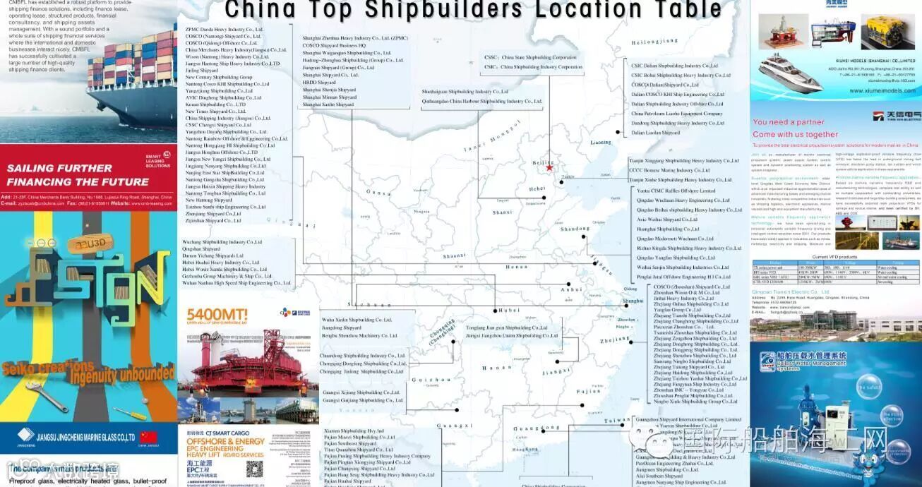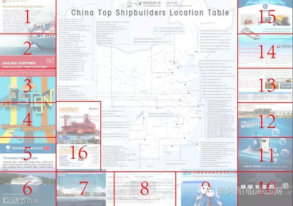 我们编辑的全英文中国前列造船厂地图,一经面世,船东、船厂、金融投资届、设计单位、研发单位、整机厂和配套商等就爱不释手,现在第二版英文地图和中文地图分别开始招商,英文图和中文图是分开的。地图正面广告位见下面的标号。一个单位一般原则上只能最多选择2个从1到16的任意2个广告位。地图背面还有广告位20个广告位。地图背面20之1一个广告位的价格是2千元人民币。所有广告位按先到先得,买完为止。