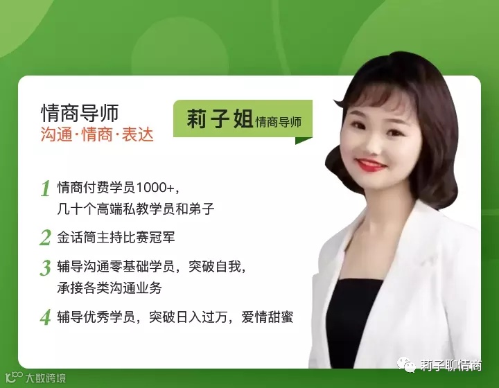 添加下方👇🏻莉子姐的微信,回复暗号:我渴望成长,免费赠送你价值2500的高情商沟通秘笈,让你开口吸睛又吸金。每日仅送前5位。。