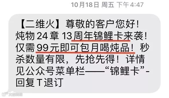 1、短信促进会员活跃:将会员卡包装成“锦鲤卡”,第一眼就很心动。最后突出“99元包月喝”这样简单易懂,冲击力强的活动,效果绝对100分!