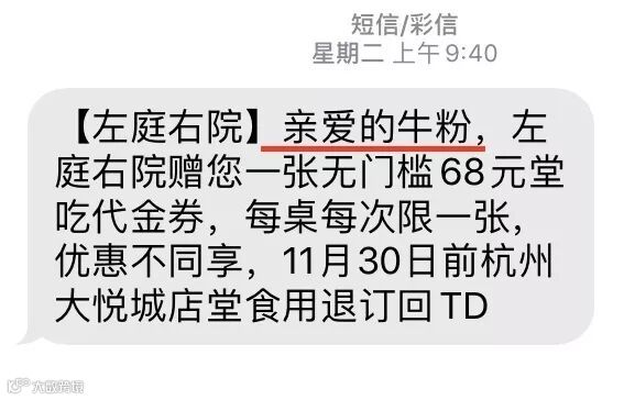 2、用短信提高优惠券核销率:给顾客赠送完优惠券一定要用短信提醒到账,目前短信比公众号的通知效果更好,左庭右院靠这次通知带来不少订单!