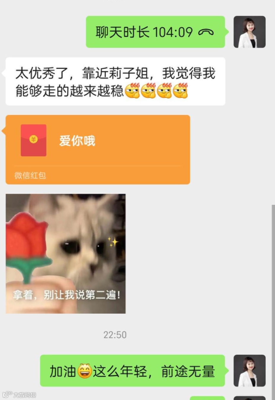 我还给对方发了随喜成长的红包,以及一段祝福的话语。后面,她每次有成长,都很喜欢来跟我分享,给大家一些实操案例,可以来锻炼一下。
