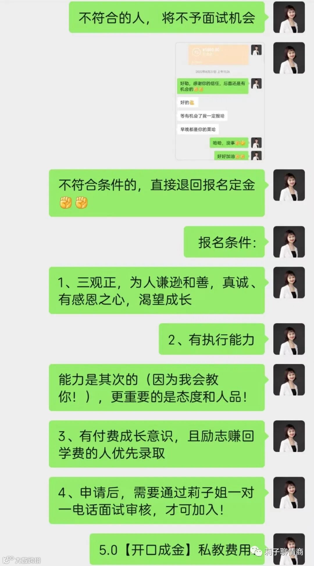 设置好门槛,将会过滤掉大多数无关的人。以莉子姐的学员门槛为例哈,这个是私教学员“门槛”,年度私教则会更严格一些。(因为至少都是5999甚至是19800的学员)