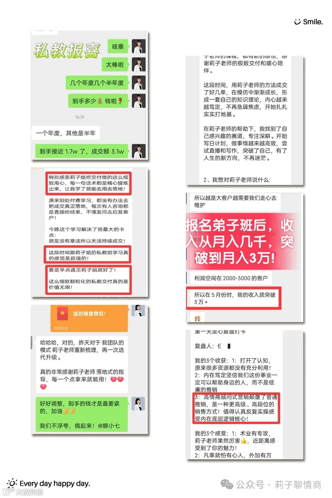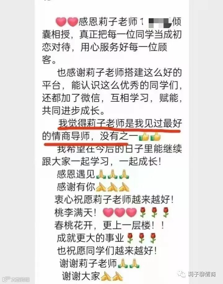 很多人都会自发到他的朋友圈去讲莉子老师,或者去分享他跟我学习的成长收获。甚至不止自己来学习,还带着他的朋友一起来。