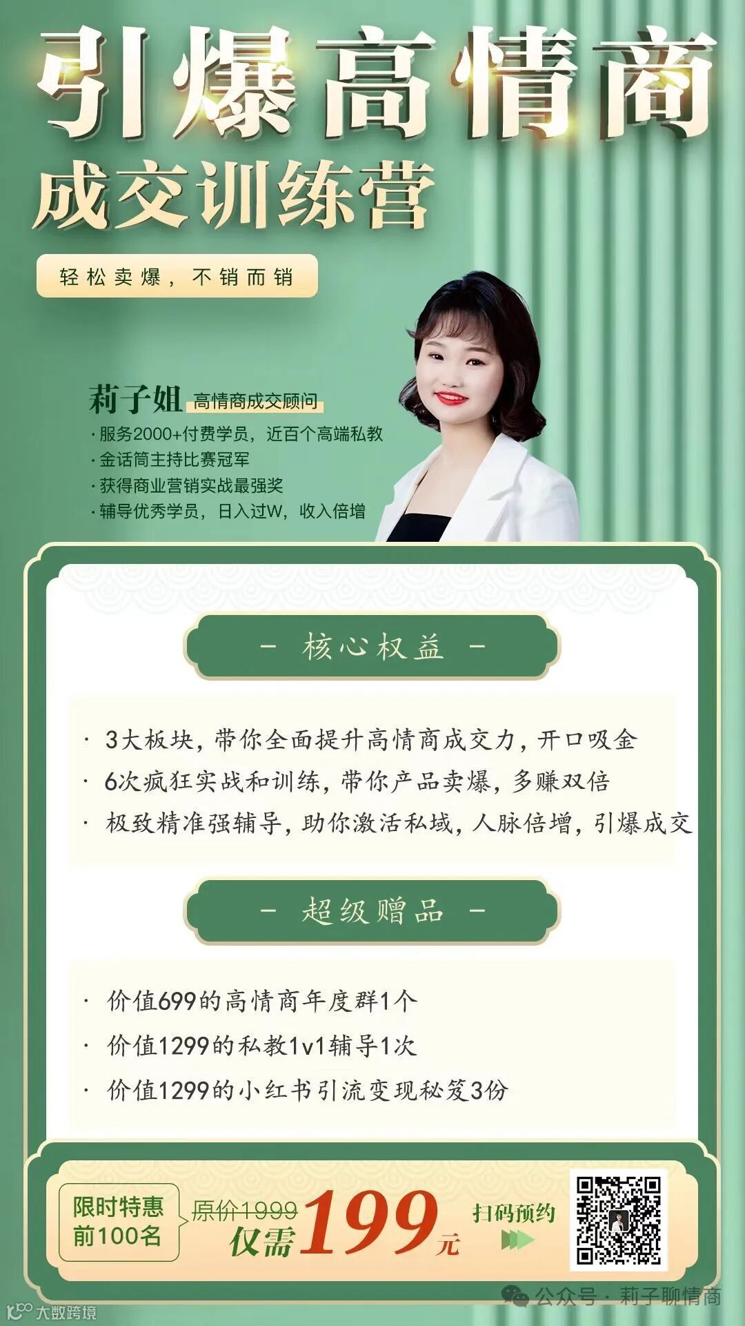 欢迎加入莉子姐2024春期的【高情商成交营】,一顿饭钱,199的价格,直接对标市面上收费4-5位数的训练营